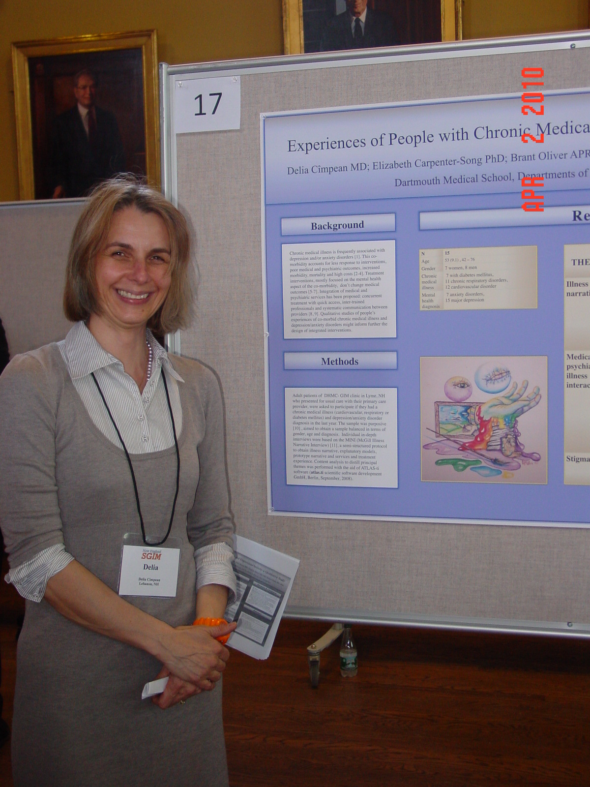 | 3 | Dr. Cimpean Delia | Dartmouth Medical School | United States | 1985 Liceul N Balcescu, Bucuresti, Bacalaureat 1992 Facultatea de Medicina Generala, UMF C. Davila, Bucuresti 1997-2002, Rezidenta in medicina interna si psihiatrie, Dartmouth Hitchcock Medical Center, NH, USA 2003 American Board of Internal Medicine 2006 American Board of Psychiatry and Neurology Din 2002, medic internist si psihiatru, Clinica de medicina interna si Clinica de psihiatrie, Profesor Asistent al Facultatii de Medicina Dartmouth in New Hampshire, USA, cCercetator la Centrul de Cercetare Psihiatrica al Universitatii Dartmouth. Cimpean, D., S. J. Bartels, et al. (2009). "Summer Institute in Evidence-based Psychiatry and Mental Health." Acad Psychiatry 33(4): 327-30. Drake R, Cimpean D, Torrey W. "Shared decision making in mental health: prospects for personalized medicine" Dialogues in Clinical Neuroscience, 2009, vol 11, No. 4,devoted to "Personalized Medicine: Prediction, Prevention, Participation." Cimpean D, Torrey W, Green ... | DSC06031.JPG |